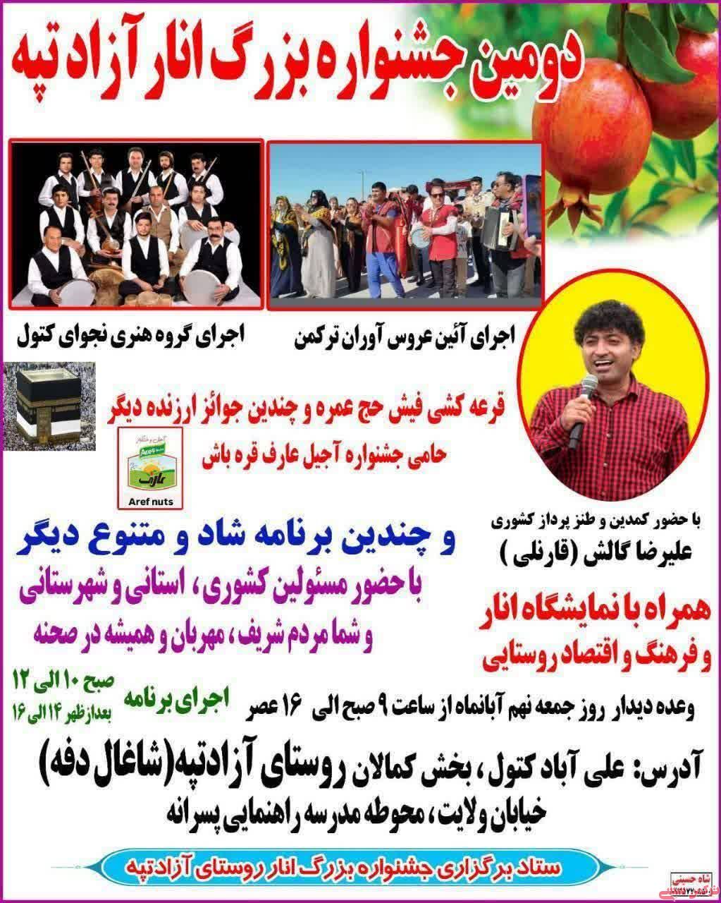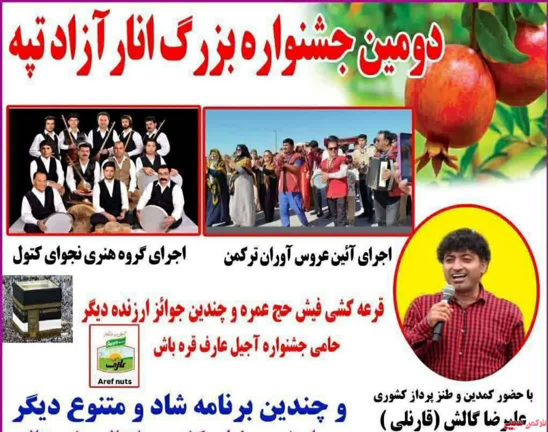 ترکمن سسی - دومین جشنواره بزرگ انار (یاقوت های سرخ) روستای آزاد تپه (شاغال دفه) از توابع بخش کمالان شهرستان علی آباد کتول در دومین جمعه آبان ماه 1404 برگزار میشود.