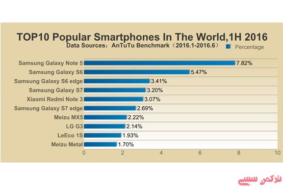 همچنین کمپانی چینی شیائومی نیز که توانسته به خوبی نظر کاربران را تامین کند با گوشی Redmi Note 3 در جایگاه پنجم قرار دارد.