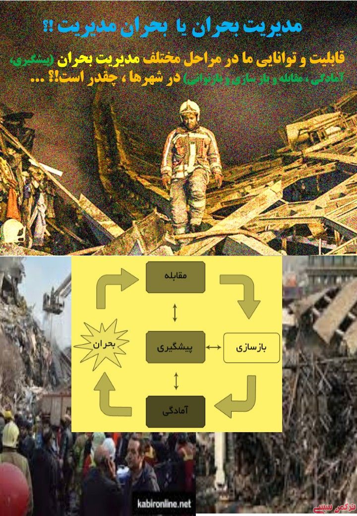 "مدیریت بحران" شامل چهار مرحله پیشگیری، آمادگی ، مقابله و باز سازی و بازتوانی است.