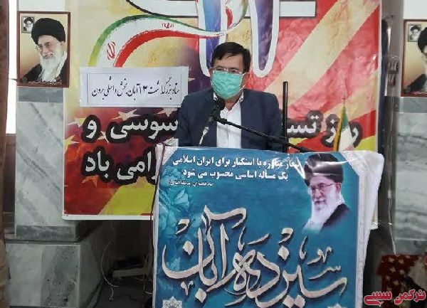 به گزارش خبرنگار ترکمن سسی، این مراسم با تلاوت آیاتی چندازکلام الله مجید آغاز شد و در ادامه  نورالله بابائی نژاد بخشدار داشلی برون ضمن خوش آمدگویی، طی سخنانی اظهار کرد: بنابه گفته رهبر کبیر انقلاب، ۱۳آبان انقلاب دوم ماست، در این روز شکوهمند ملت غیور ودانشجویان فرهیخته ما به استکبار جهانی ثابت کردند درمقابل هیچ ظلم وستمی ساکت نخواهیم نشست بلکه ریشه آنها را خواهیم خشکاند.