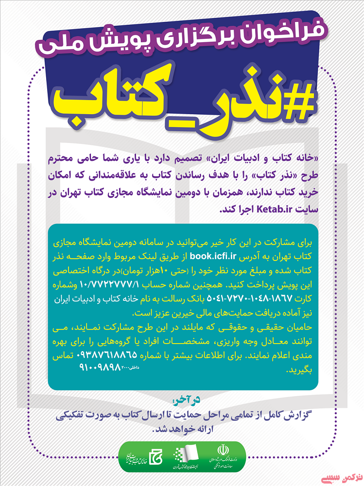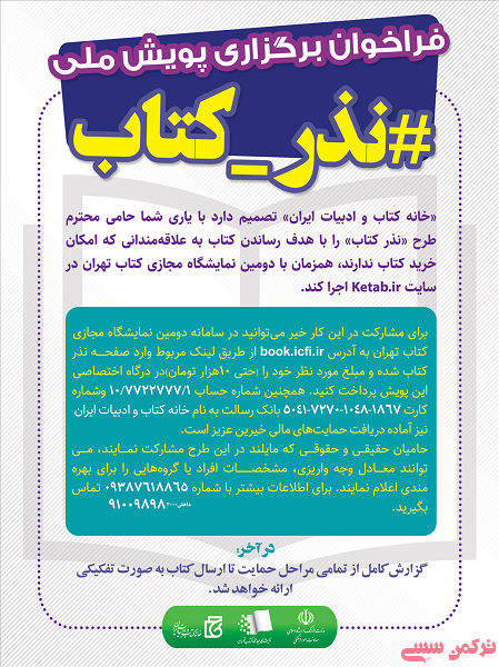 ترکمن سسی - پویش ملی «نذر کتاب» همزمان با دومین نمایشگاه مجازی کتاب تهران به همت خانه کتاب و ادبیات ایران آغاز شد.