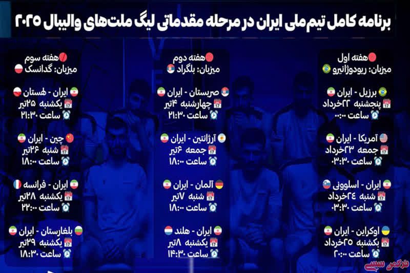 در ادامه، میتوانید برنامه کامل بازیهای ایران در لیگ ملتهای والیبال ۲۰۲۵ را مشاهده کنید.