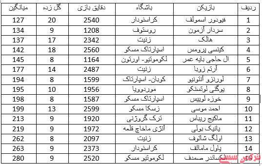 بهترین گلزن لیگ روسیه از نظر آمار کسی نیست جز فیودور اسمولف. بازیکنی که در 2540 دقیقه بازی 20 گل وارد دروازه حریفان کرده است. بعد از اسمولف که برای کراسنودار توپ می زند، سردار آزمون قرار گرفته و پس از او هم نوبت به هالک برزیلی می رسد. هالک که برای تیم ملی برزیل هم بازی می کند 2342 دقیقه به میدان رفته و 17 گل به ثمر رسانده. یعنی به طور میانگین هر 137 دقیقه یک گل. آمار هالک 3 دقیقه بیشتر از آزمون است. پس از هالک هم کینسی پرومس از اسپارتاک مسکو قرار دارد و رده پنجم را نیز ال حاجی بایه عمر به خود اختصاص داده. مهاجمی که البته نیم فصل راهی اورتون شد تا برای این تیم بازی کند.