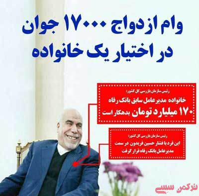 ترکمن سسی- میزان بدهی مدیر عامل سابق بانک رفاه برابر با وام ازدواج 17 هزار جوان ایرانی است.