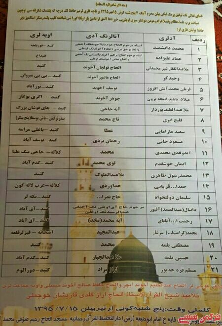 این مراسم صبح روز پنج شنبه 15 مهرماه در آق قایه گنبدکاووس،خیابان امام ابوحنیفه (رض)مسجد رحیم صوفی برگزار خواهد شد.