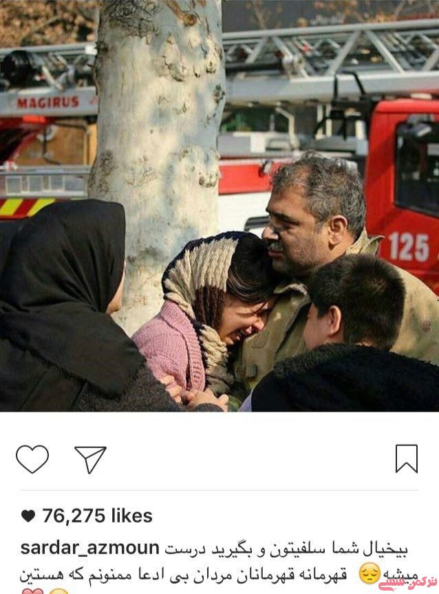 به گزارش خبرنگار ترکمن سسی،سردار آزمون با انتشار عکسی مربوط به حادثه ساختمان پلاسکو نوشت:«شما سلفیتون و بگیرید درست میشه.قهرمان قهرمانان،مردان بی ادعا .. ممنونم که هستین.»