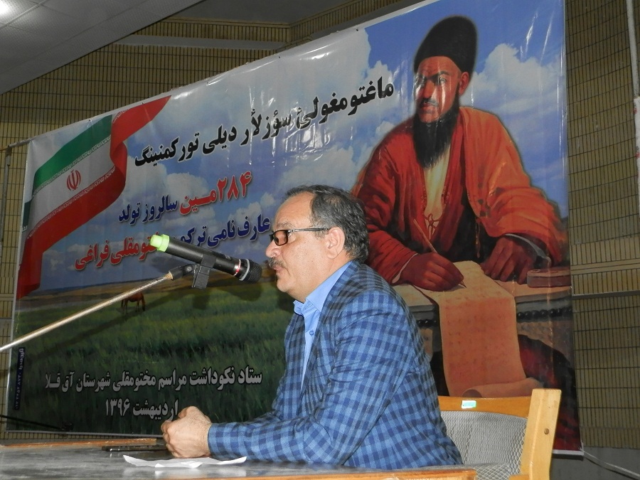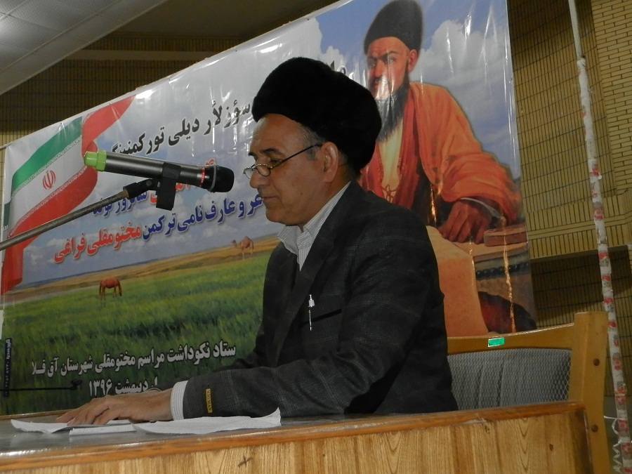 به گزارش خبرنگار تركمن سسي در اين مراسم فرماندار شهرستان آق قلا در خصوص شخصيت شاعر شهير تركمن مختومقلي فراغي سخنراني نمود و گفت :"مختومقلی"، انسانی دیندار، حق طلب، عدالت خواه، دردمند مردم، مخالف هرگونه ظلم و جفا به بندگان خدا،در صدد ساختن خویشتن خویش، گذرکرده از هوای نفس خویش و در پی سازگار کردن وجود و هستی خویش با هدف حقیقی خلقت ذات انسانی خویش بوده است . مختومقلی مثل هر عارفی نامی دیگری در طول تاریخ سرزمین ایران اسلامی به جای نصیحت کردن انسان ها، خودش سعی می کرد یک الگوی عملی از مفهوم انسان واقعی باشد.