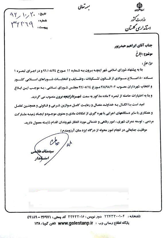 به گزارش خبرنگار ترکمن سسی امروز طی مراسمی با حضور مسئولین شهرستانی، ابراهیم حیدرپور به عنوان شهردار جدید شهر مرزی اینچه برون معرفی و فعالیت خود را آغاز کرد.حکم انتصاب شهردار اینچه برون در تاریخ 20 دی توسط استاندار گلستان صادر شده است.