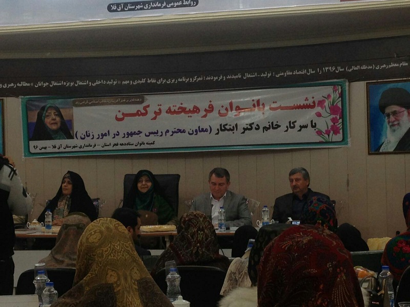گفتني است ديدار بانوان تركمن فعال فرهنگي و اجتماعي ، بانوان داراي مسئوليت هاي اجتماعي ، بانوان داراي سابقه حضور در شوراهاي اسلامي شهر و روستا و بانوان كارآفرين با پیگیری ها و هماهنگی بهناز ایمری بانوی فعال ترکمن با دفتر معصومه ابتکار و حوزه های ذیربط استانی و به میزبانی فرمانداري شهرستان آق قلا انجام شده است.