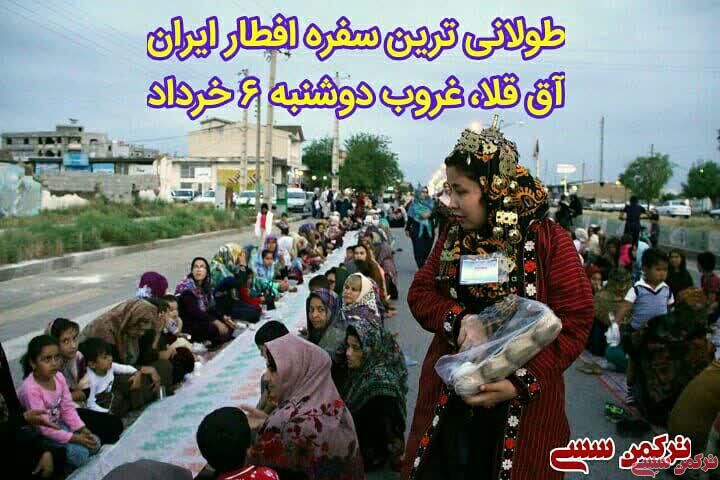ترکمن سسی - طولانی ترین سفره افطاری ایران ویژه مناطق سیل زده ، غروب دوشنبه ۶ خردادماه ۱۳۹۸در شهر آق قلا با شعار وحدت ، همدلی ، همزبانی برپا شد.