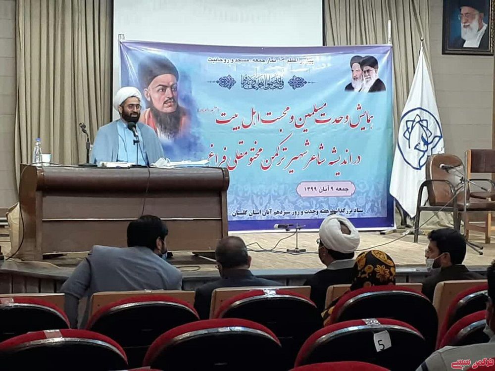 به گزارش خبرنگار ترکمن سسی، حجت الاسلام نورعلی دیلم عصر امروز جمعه در همایش وحدت مسلمین و محبت اهل بیت (ع) در اندیشه شاعر و عارف شهیر ترکمن مختومقلی فراغی با تبریک ولادت باسعادت حضرت محمد مصطفی (ص)، امام صادق (ع) و ایام پربرکت هفته وحدت گفت: عشق به پیامبر(ص) و اولاد پیامبر (ع) و توجه به مضامین اتحاد و همدلی در جامعه که در اشعار مختومقلی فراغی موج می زند از عوامل مهم در تقریب و مودّت بین مذاهب اسلامی است.
