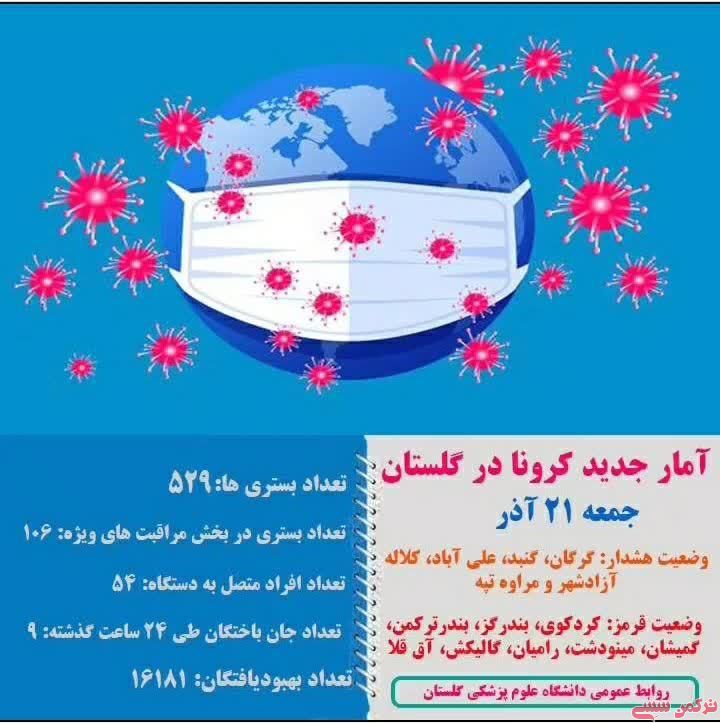 وی خاطرنشان کرد: در حال حاضر۵۲۹ بیمار مبتلا به کرونا در بیمارستان های استان بستری اند، که این عدد نسبت به هفته قبل با کاهش چشمگیری مواجه شده است، از این تعداد ۱۰۶بیمار در بخش مراقبت های ویژه و ۵۴ بیمار به دستگاه ونتیلاتور متصل اند، همچنین تاکنون ۱۶ هزار و ۱۸۱ فرد مبتلا به کرونا در استان بهبود یافته اند و متاسفانه طی ۲۴ ساعت گذشته ۹ فوتی بر اثرکرونا در گلستان ثبت شد