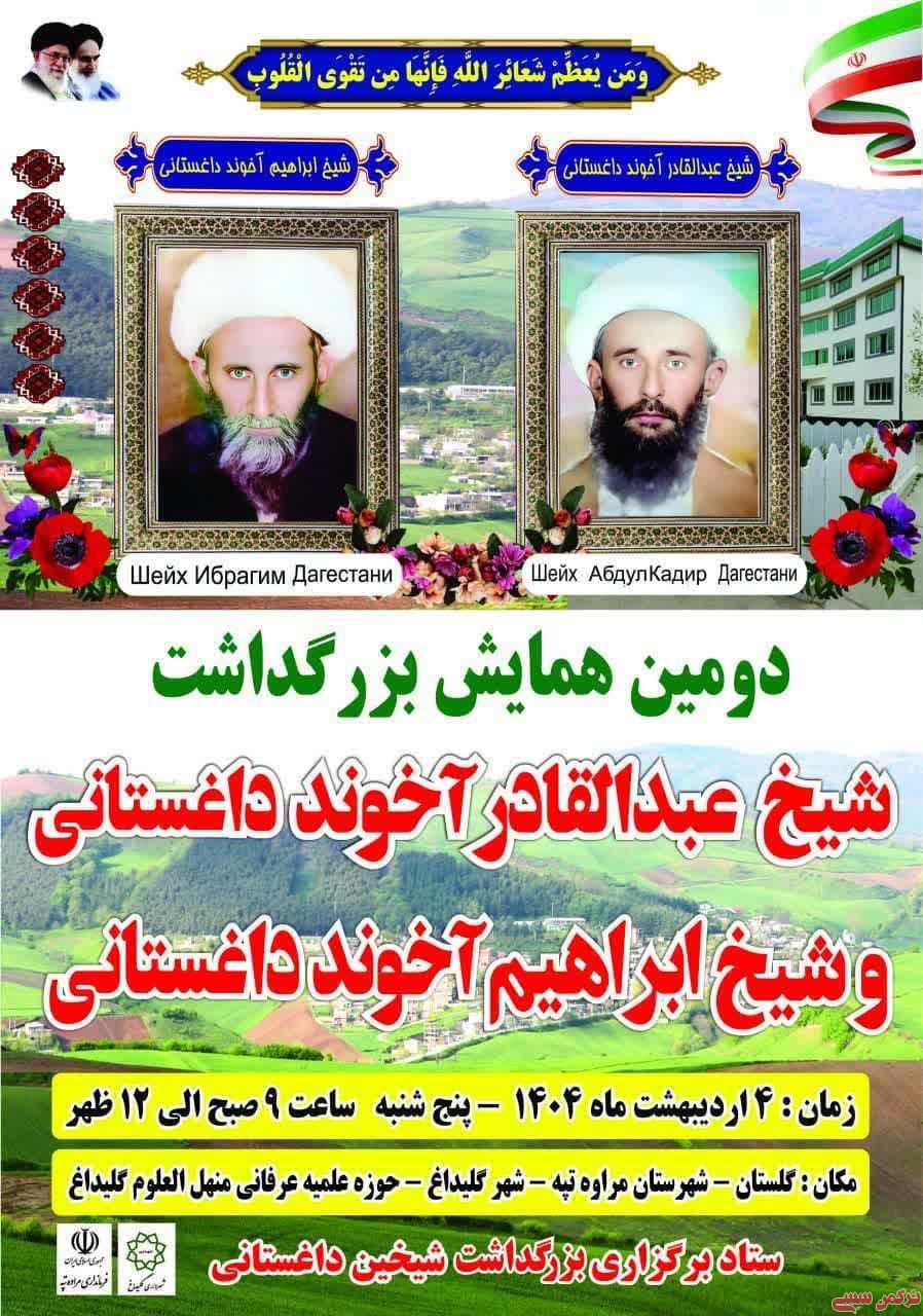ترکمن سسی - عبدالرضا نظری - دومین همایش نکوداشت شیخین عبدالقادر آخوند و ابراهیم آخوند داغستانی صبح پنچ شنبه چهارم اردیبهشت 1404 در گلیداغ برگزار می شود.