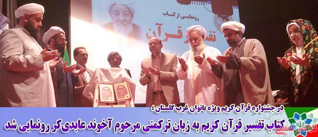 ترکمن سسی - در جشنواره قرآن کریم ویژه بانوان غرب گلستان ؛ از کتاب تفسیر قرآن کریم به زبان ترکمنی مرحوم آخوند عابدیکر رونمایی شد.